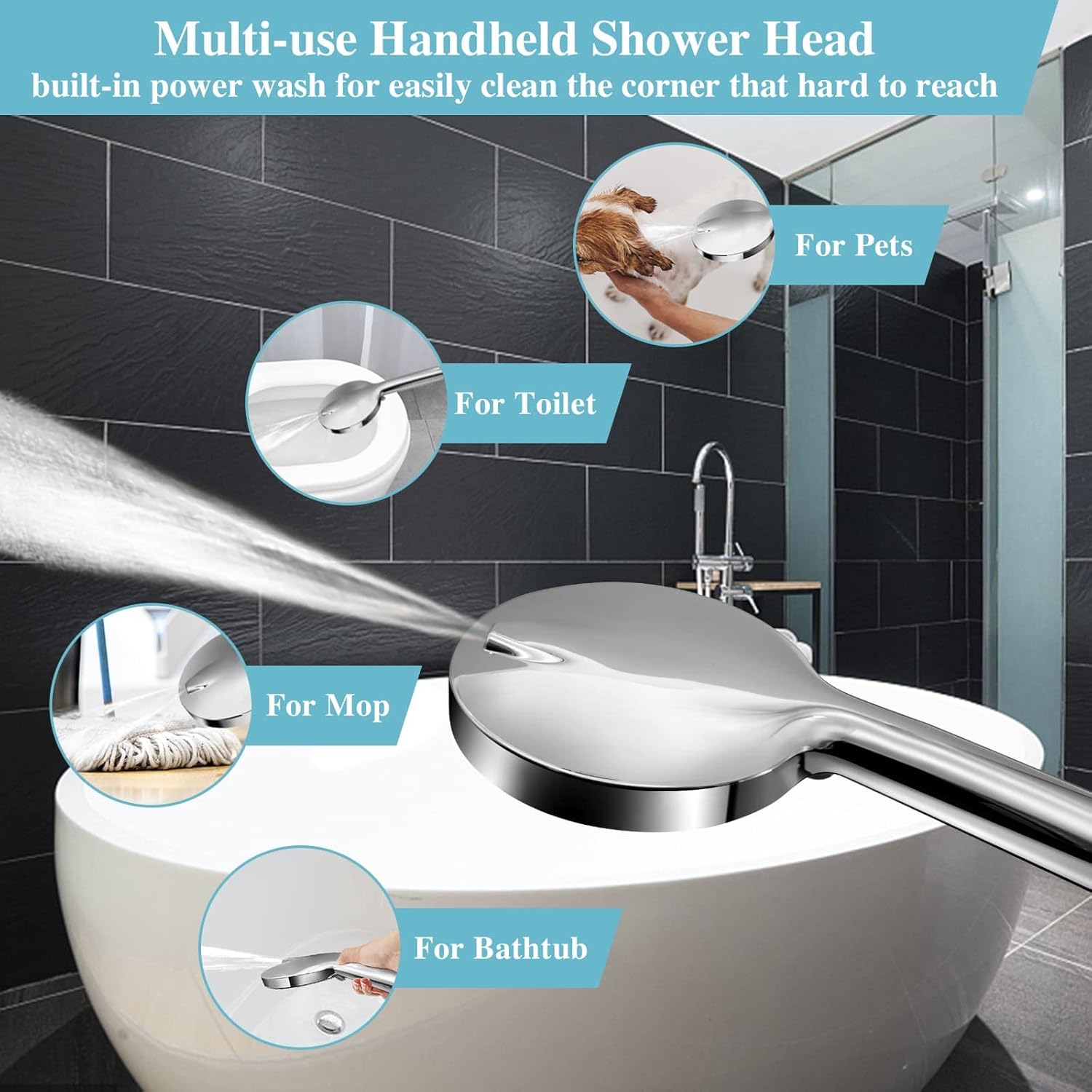 - Cabezal de ducha de mano con 6 ajustes: viene con 6 funciones de pulverización, incluyendo lluvia, masaje, lluvia y masaje, lluvia potente, masaje y lavado potente. Puedes personalizar hasta 6 funciones para disfrutar de la ducha única con diferentes presión de agua y volumen de agua. Con manguera de ducha de 60 pulgadas de largo es más conveniente y es perfecta para bañar a niños, lavar mascotas y aplicaciones de limpieza.